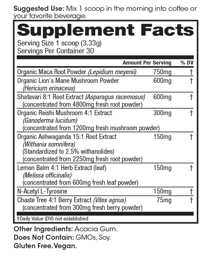Crafted with Maca, Ashwagandha, Shatavari, and Reishi, this powder is packed with functional herbs known to promote calm and help your body respond to everyday stressors. Uplifting ingredients like Lemon Balm, Lion’s Mane, and L-Tyrosine work together to support clarity and a positive mindset, while Chaste Tree Extract offers gentle support for hormone balance throughout the day.