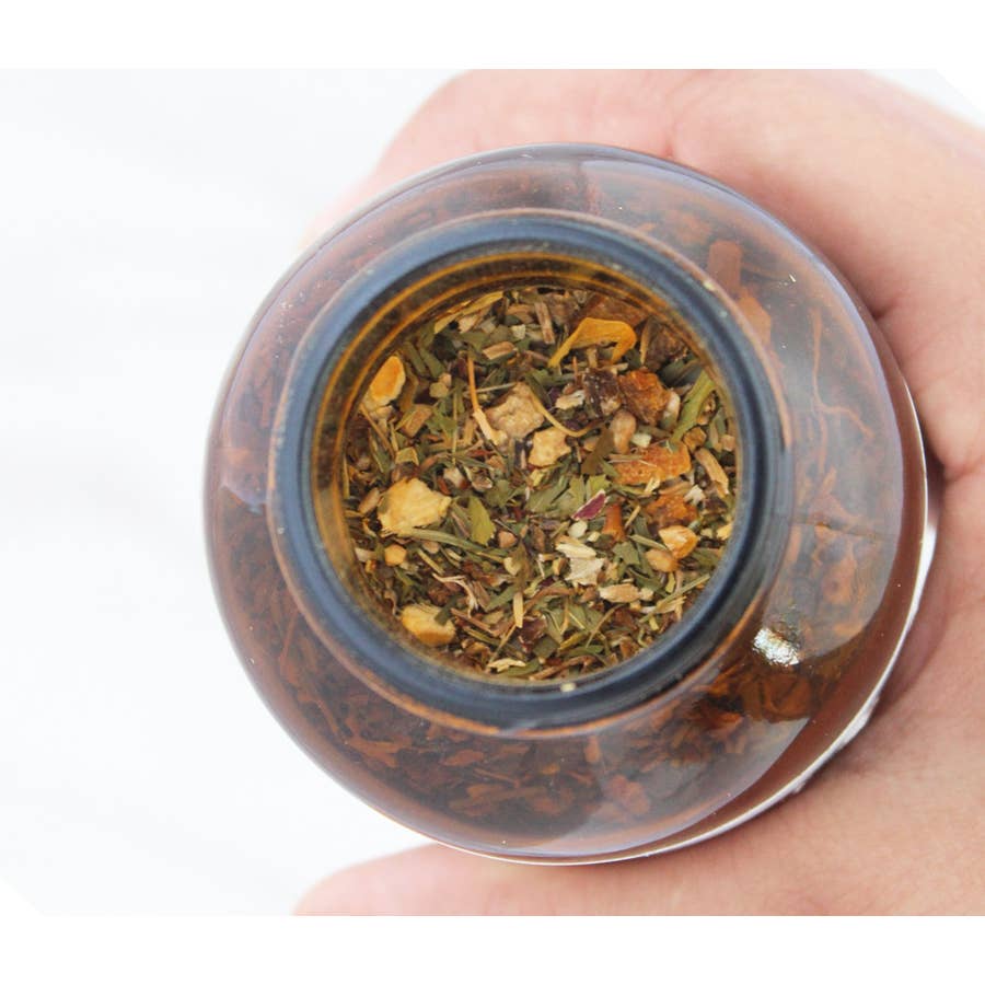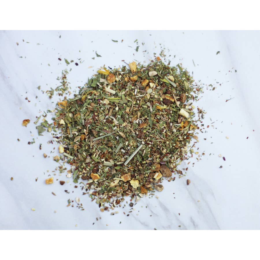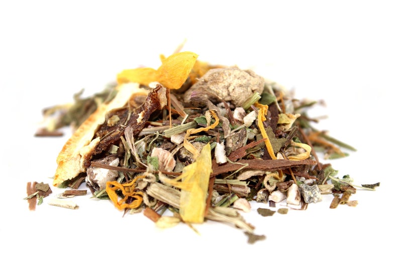 Ingredients: Organic echinacea root, organic green rooibos, organic orange peel, organic alfalfa leaf, organic burdock root, organic dandelion root, organic echinacea herb, organic sarsaparilla root, organic ginger root, organic lemongrass, organic plantain, organic hawthorn leaves, organic calendula.